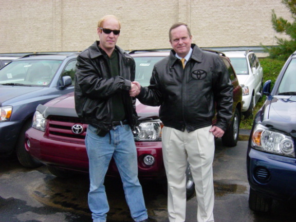 Robert Schiloni of Checks Play delivers a custom leather jacket to the president of a local Toyota dealership.